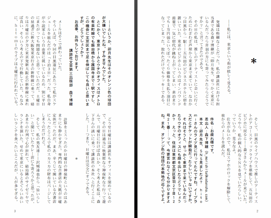 講談社ノベルスの組版に合わせるために京極夏彦の『鵼の碑』(ノベルス版)からリバースエンジニアリングした結果、講談社ノベルスの組版はこんな感じになりました。