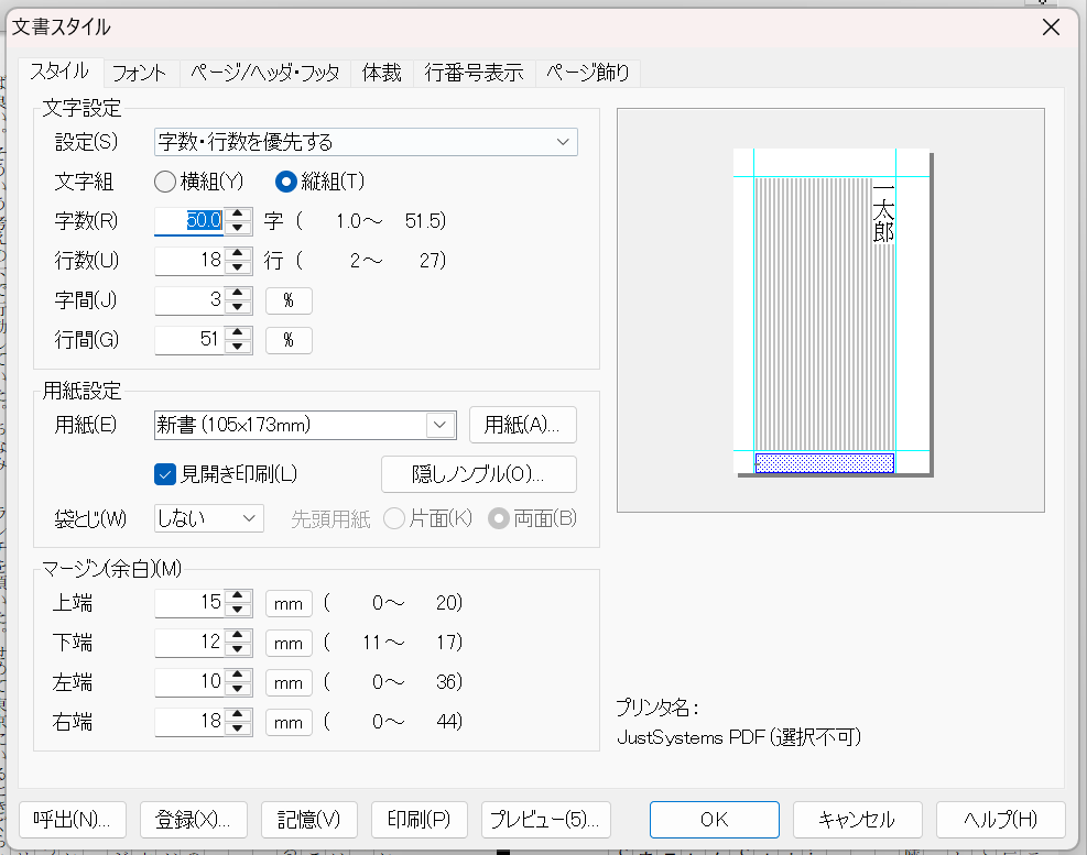 設定を文章スタイルに流し込んでいきます。(マージンに関してはあくまでも私の直感なので各自手元にある適当な講談社ノベルスで測ってください)