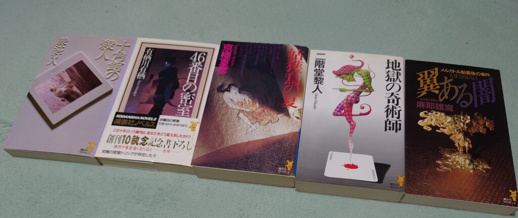 私は知っての通り全盛期の講談社ノベルスで殴られた人間なので、入門として読むなら写真の5作だと思います。今なら講談社文庫で新装版が出ている作品もあるので多分入手ハードルはかなり低いと思います。(少なくとも綾辻行人と有栖川有栖、京極夏彦は講談社文庫で新装改訂版が出ています)